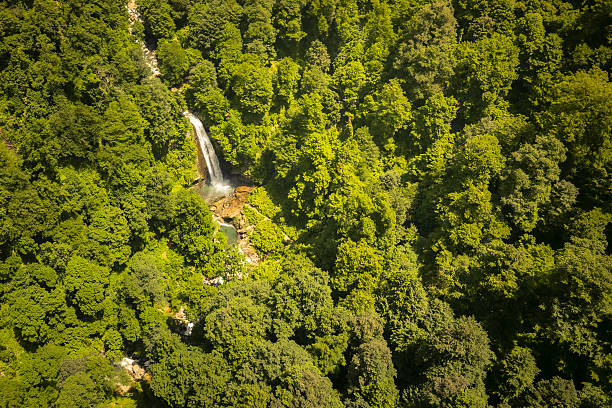 Aerial view of Ninoskhevi Waterfall cascading through lush green forest into a rocky pool, located in Lagodekhi Protected Areas, Georgia