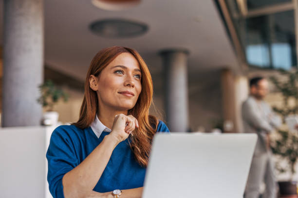 A portrait of a pensive woman sitting at a desk in the office.